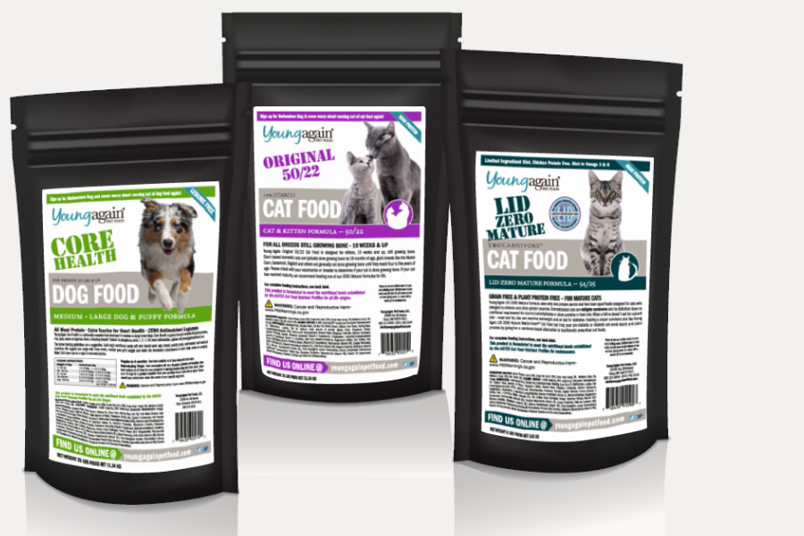 Young Again foods are packed in high-quality, thick foil bags that keep it fresh and protected from light. It is important to note that our food should be stored in its original resealable bag (25 lb. bags do not include a zip seal). If you choose to transfer your pet food to another container, make sure it has been thoroughly cleaned and is free of any old oils. These can cause your new food to become rancid and inedible for your pet.